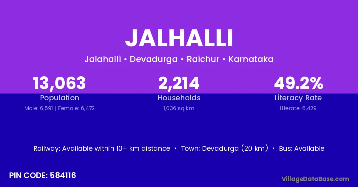 Devadurga (20 km) is the nearest town to Jalhalli village for major economic activities and is located approximately 20 km away.