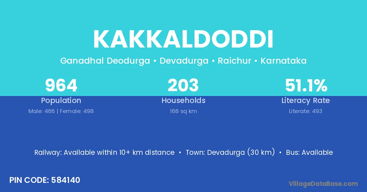 Devadurga (30 km) is the nearest town to Kakkaldoddi village for major economic activities and is located approximately 30 km away.