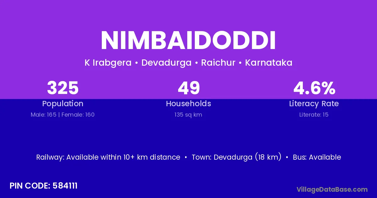 Devadurga (18 km) is the nearest town to Nimbaidoddi village for major economic activities and is located approximately 18 km away.