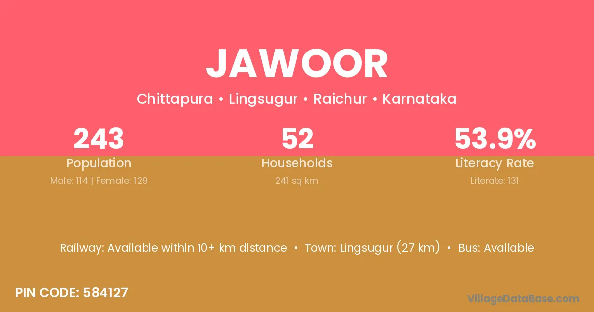 Jawoor village has a total population of 243 people, of which 114 are males and 129 are females.
