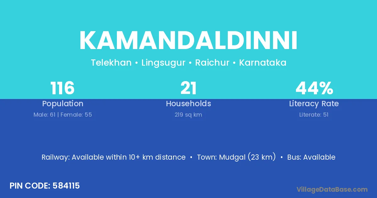 Mudgal (23 km) is the nearest town to Kamandaldinni village for major economic activities and is located approximately 23 km away.