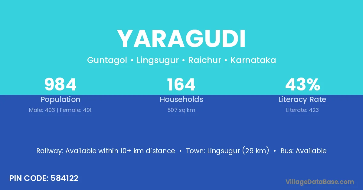 Yaragudi village has a total population of 984 people, of which 493 are males and 491 are females.