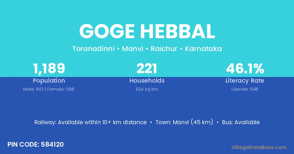 Manvi (45 km) is the nearest town to Goge Hebbal village for major economic activities and is located approximately 45 km away.