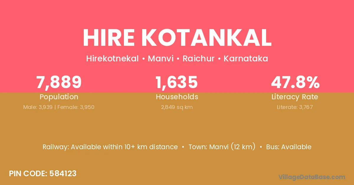 Manvi (12 km) is the nearest town to Hire Kotankal village for major economic activities and is located approximately 12 km away.
