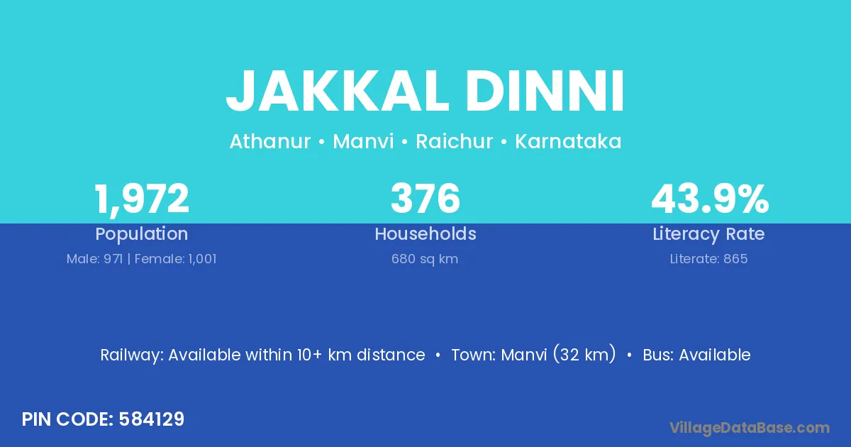 Manvi (32 km) is the nearest town to Jakkal Dinni village for major economic activities and is located approximately 32 km away.