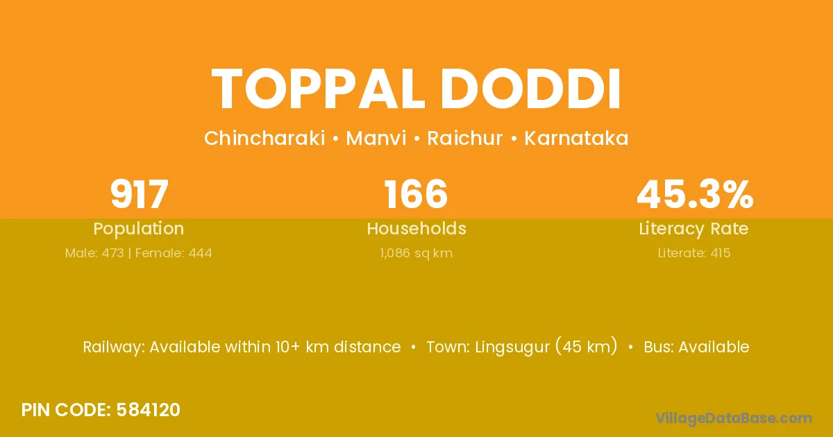 Lingsugur (45 km) is the nearest town to Toppal Doddi village for major economic activities and is located approximately 45 km away.