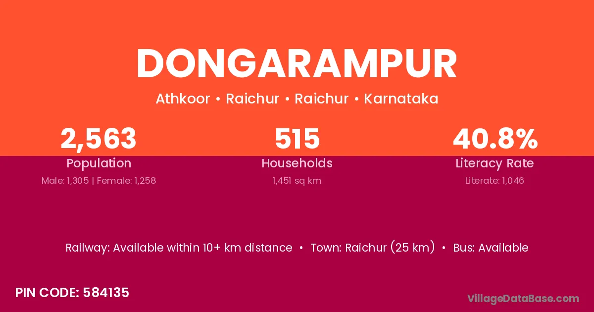 Raichur (25 km) is the nearest town to Dongarampur village for major economic activities and is located approximately 25 km away.