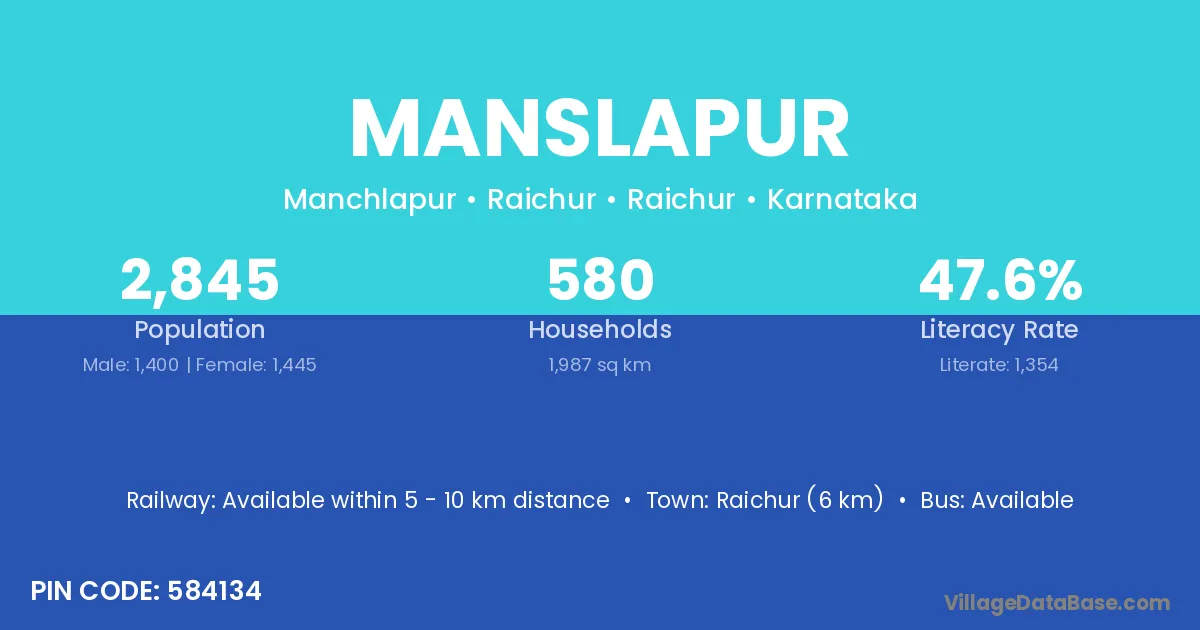 Raichur (6 km) is the nearest town to Manslapur village for major economic activities and is located approximately 6 km away.