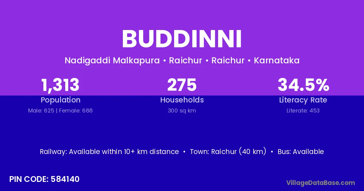 Sindhnur (34 km) is the nearest town to Buddinni village for major economic activities and is located approximately 34 km away.