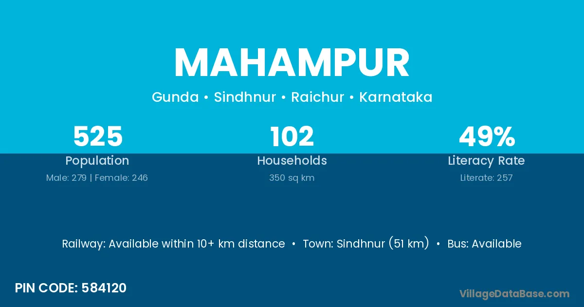 Sindhnur (51 km) is the nearest town to Mahampur village for major economic activities and is located approximately 51 km away.