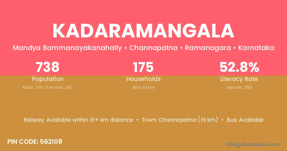 Kadaramangala village has a total population of 738 people, of which 376 are males and 362 are females.
