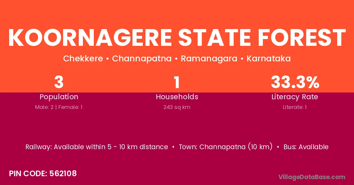 Koornagere State Forest village has a total population of 3 people, of which 2 are males and 1 are females.