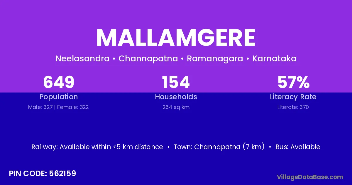 Channapatna (7 km) is the nearest town to Mallamgere village for major economic activities and is located approximately 7 km away.