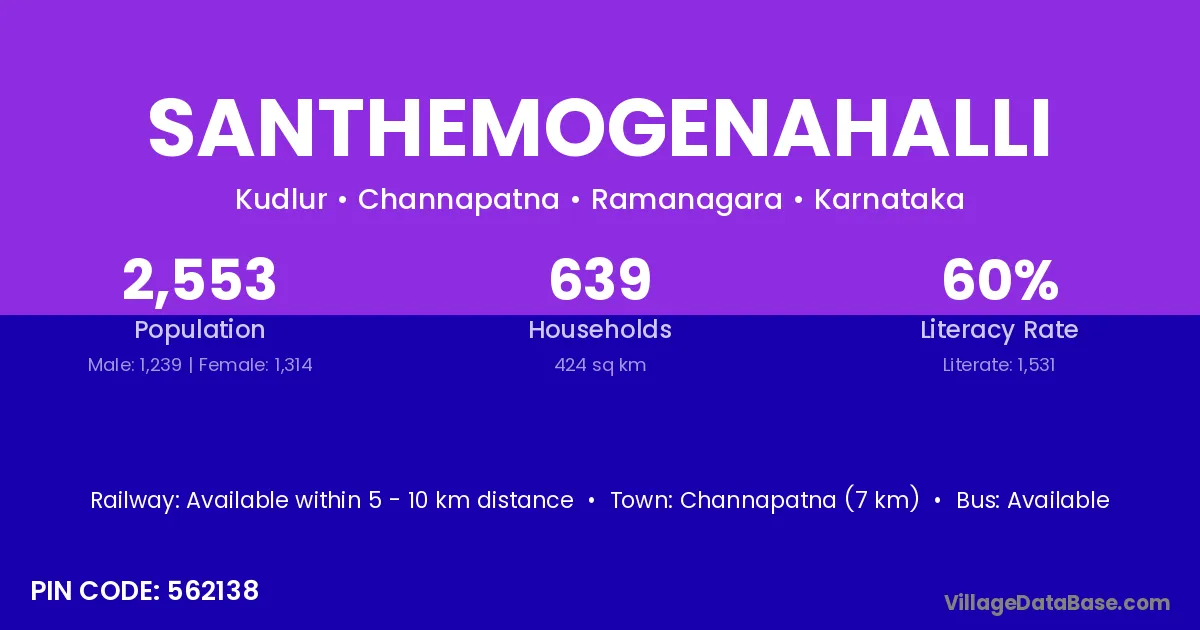 Channapatna (7 km) is the nearest town to Santhemogenahalli village for major economic activities and is located approximately 7 km away.
