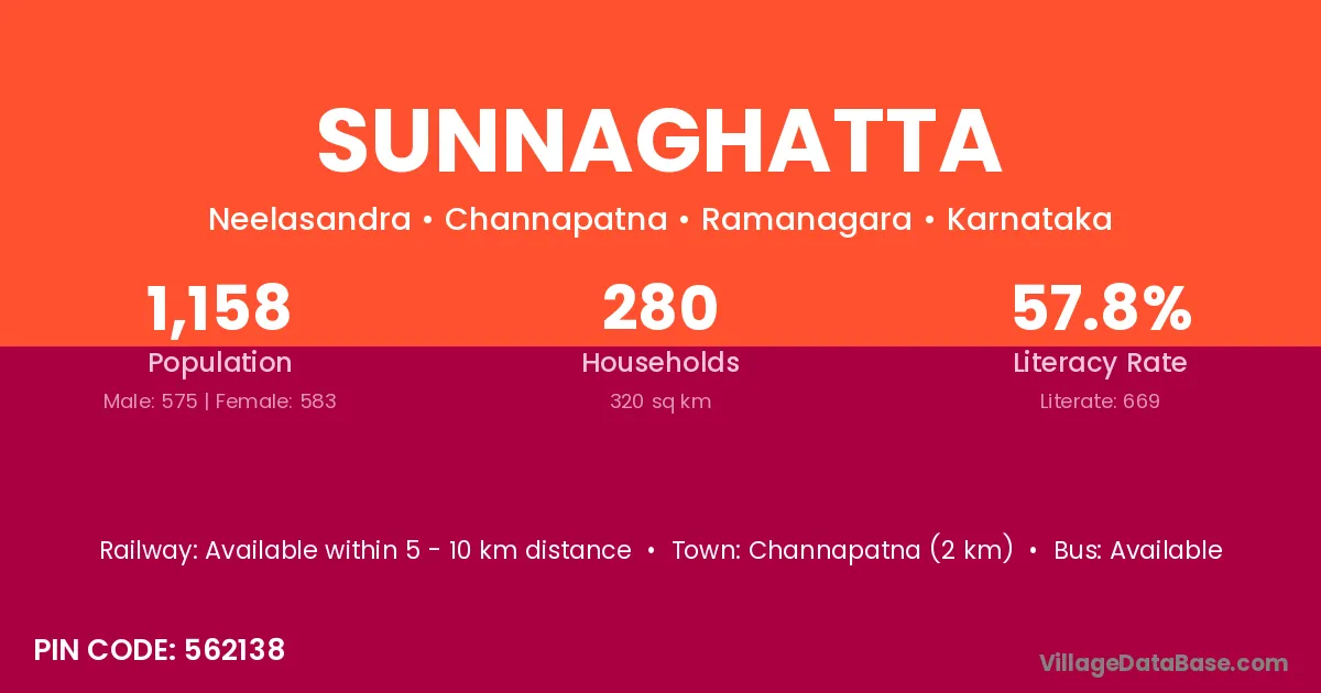 Channapatna (2 km) is the nearest town to Sunnaghatta village for major economic activities and is located approximately 2 km away.