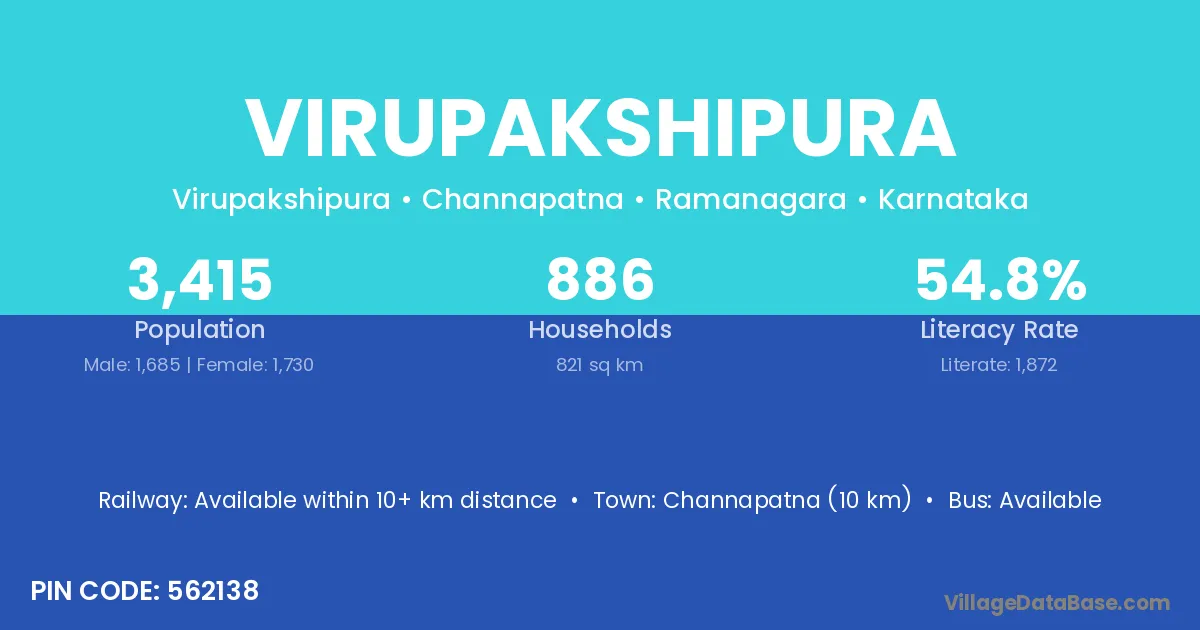 Virupakshipura village has a total population of 3,415 people, of which 1,685 are males and 1,730 are females.