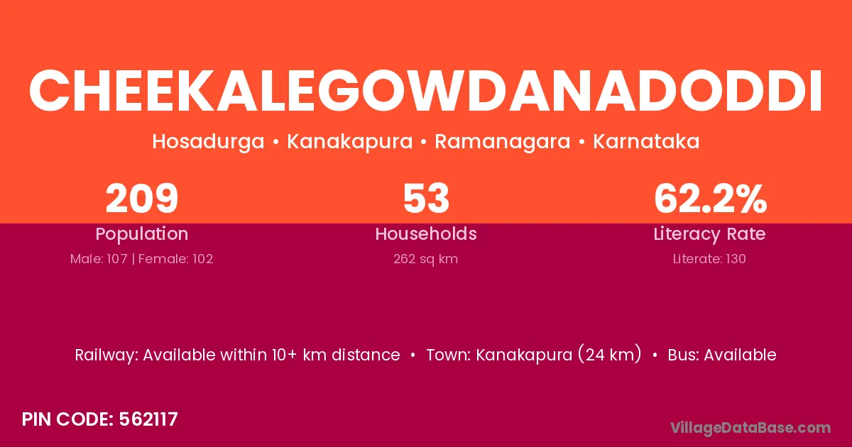 Cheekalegowdanadoddi village has a total population of 209 people, of which 107 are males and 102 are females.