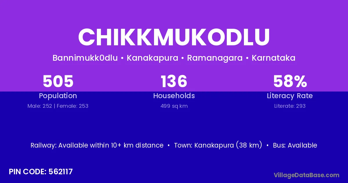 Kanakapura (38 km) is the nearest town to Chikkmukodlu village for major economic activities and is located approximately 38 km away.