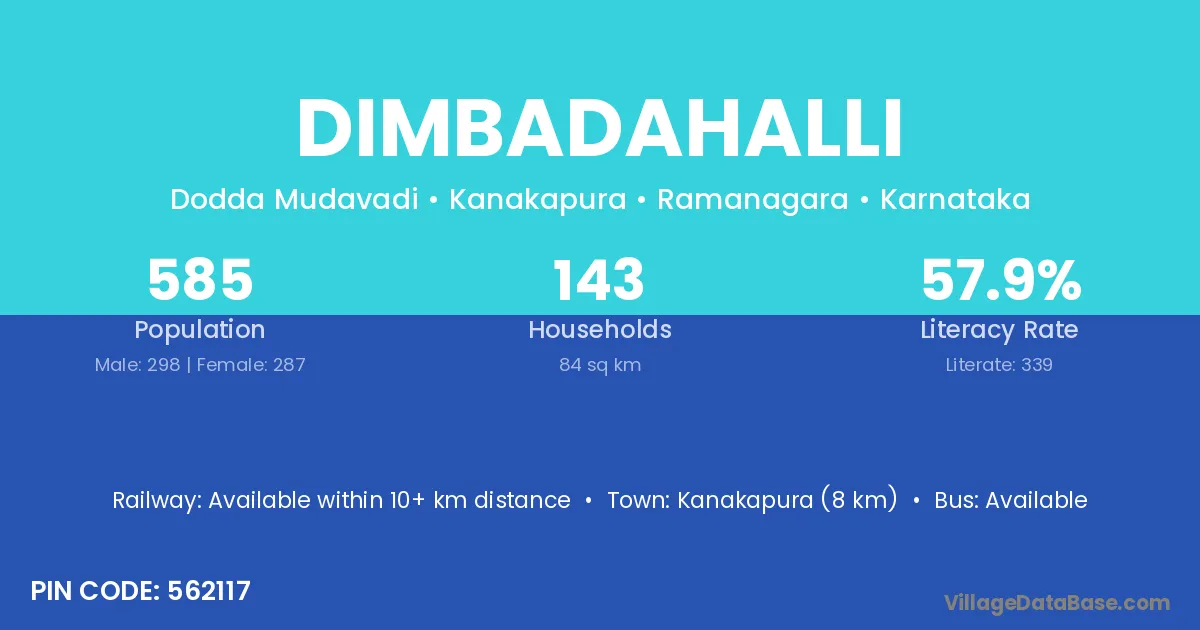 Kanakapura (8 km) is the nearest town to Dimbadahalli village for major economic activities and is located approximately 8 km away.