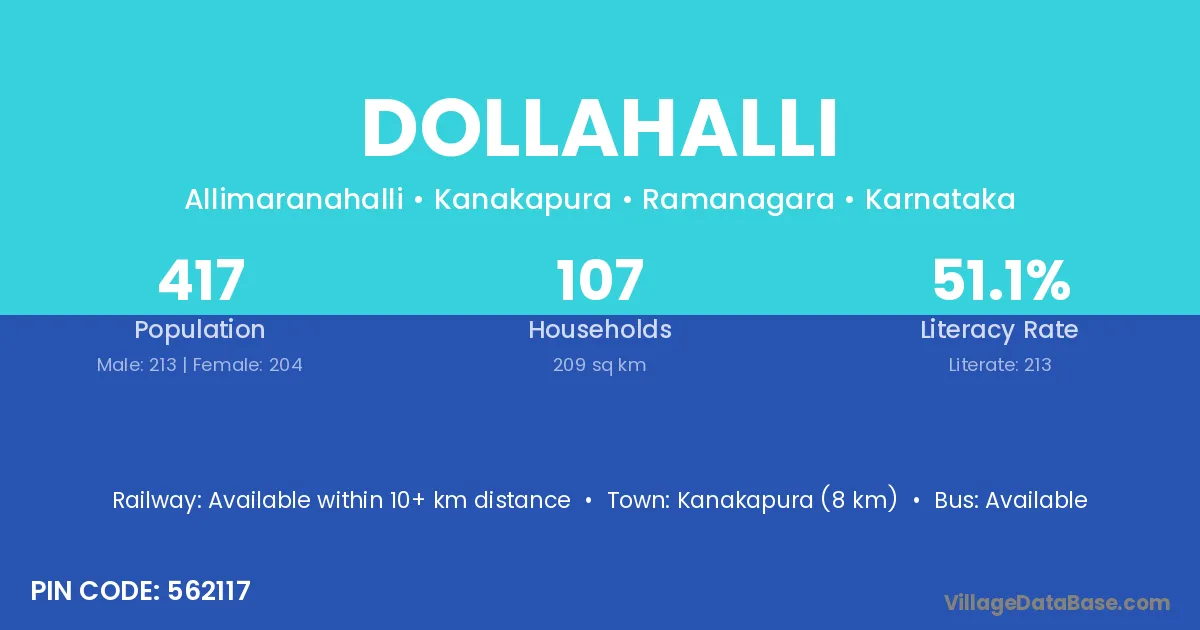 Dollahalli village has a total population of 417 people, of which 213 are males and 204 are females.