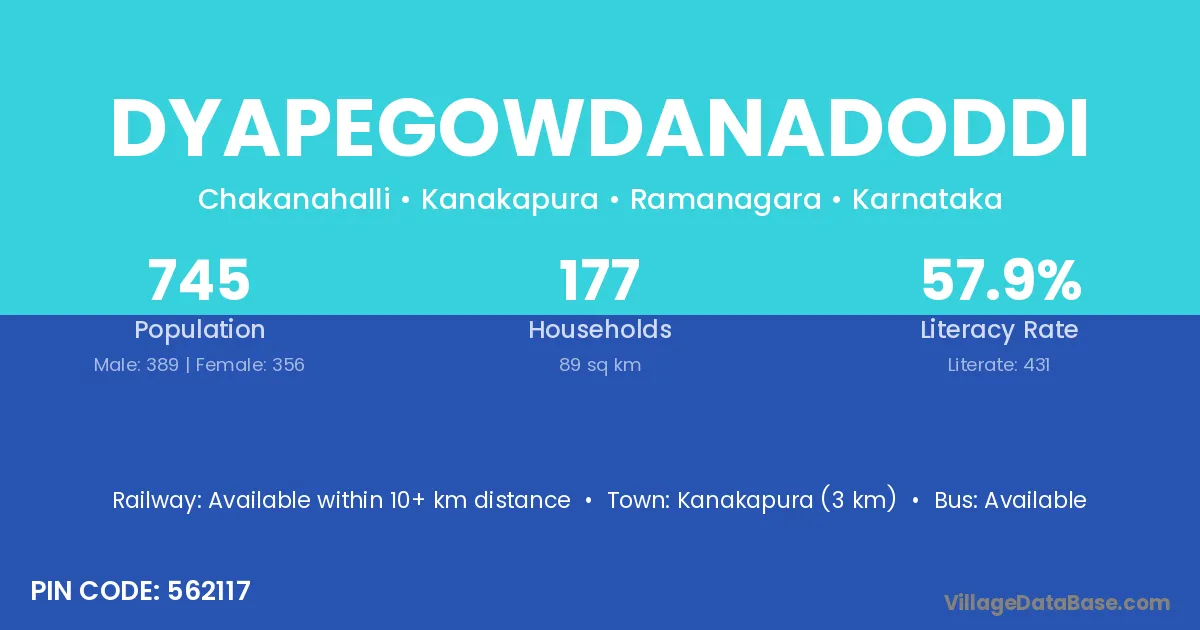 Kanakapura (3 km) is the nearest town to Dyapegowdanadoddi village for major economic activities and is located approximately 3 km away.