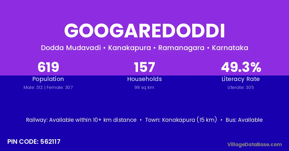 Kanakapura (15 km) is the nearest town to Googaredoddi village for major economic activities and is located approximately 15 km away.