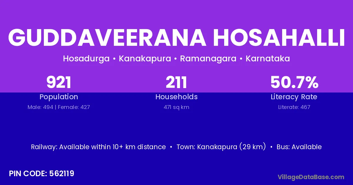Guddaveerana Hosahalli village has a total population of 921 people, of which 494 are males and 427 are females.