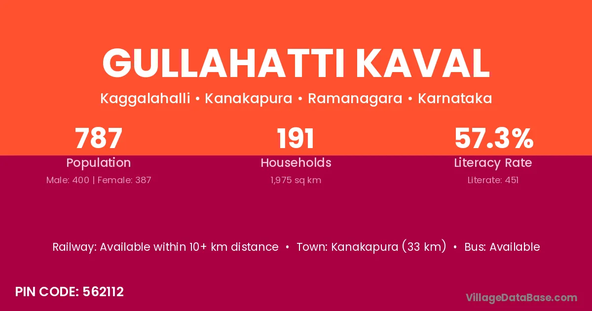 Kanakapura (33 km) is the nearest town to Gullahatti Kaval village for major economic activities and is located approximately 33 km away.