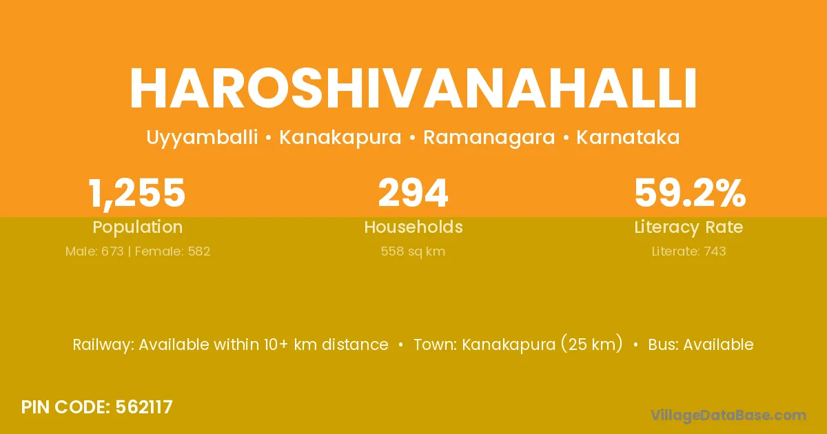 Kanakapura (25 km) is the nearest town to Haroshivanahalli village for major economic activities and is located approximately 25 km away.