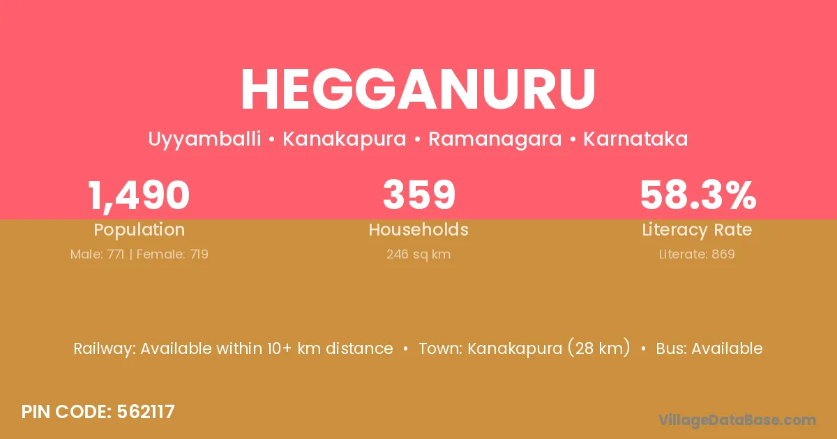 Kanakapura (28 km) is the nearest town to Hegganuru village for major economic activities and is located approximately 28 km away.