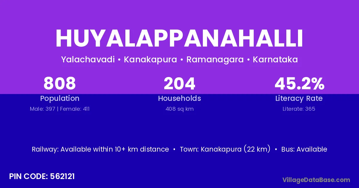 Kanakapura (22 km) is the nearest town to Huyalappanahalli village for major economic activities and is located approximately 22 km away.