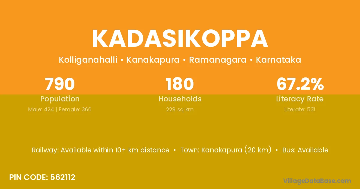Kadasikoppa village has a total population of 790 people, of which 424 are males and 366 are females.