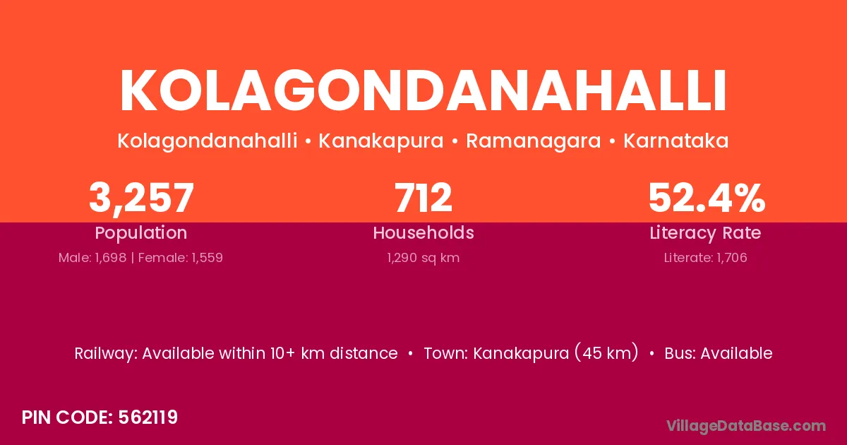 Kanakapura (45 km) is the nearest town to Kolagondanahalli village for major economic activities and is located approximately 45 km away.