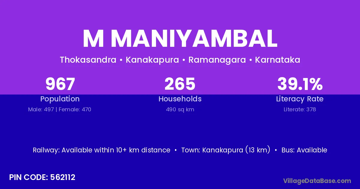 Kanakapura (13 km) is the nearest town to M Maniyambal village for major economic activities and is located approximately 13 km away.
