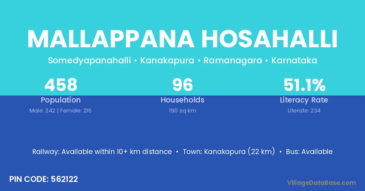 Mallappana Hosahalli village has a total population of 458 people, of which 242 are males and 216 are females.