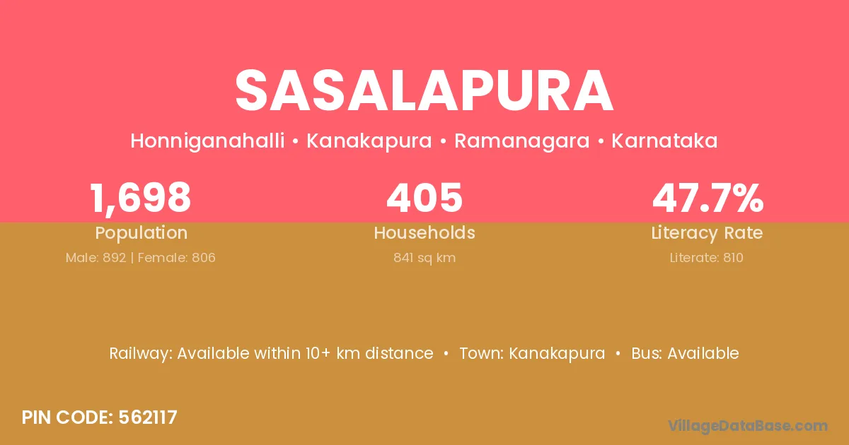 Sasalapura village has a total population of 1,698 people, of which 892 are males and 806 are females.