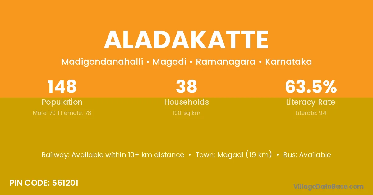 Magadi (19 km) is the nearest town to Aladakatte village for major economic activities and is located approximately 19 km away.
