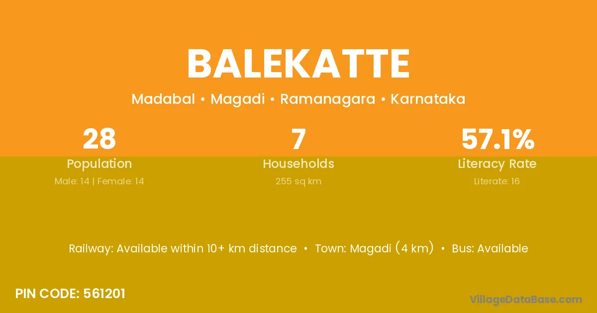 Magadi (4 km) is the nearest town to Balekatte village for major economic activities and is located approximately 4 km away.