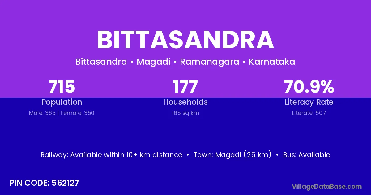 Magadi (25 km) is the nearest town to Bittasandra village for major economic activities and is located approximately 25 km away.