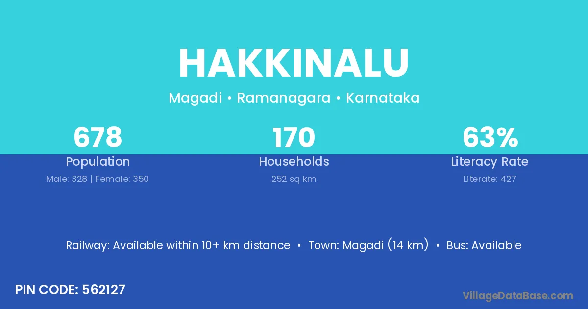 Magadi (14 km) is the nearest town to Hakkinalu village for major economic activities and is located approximately 14 km away.