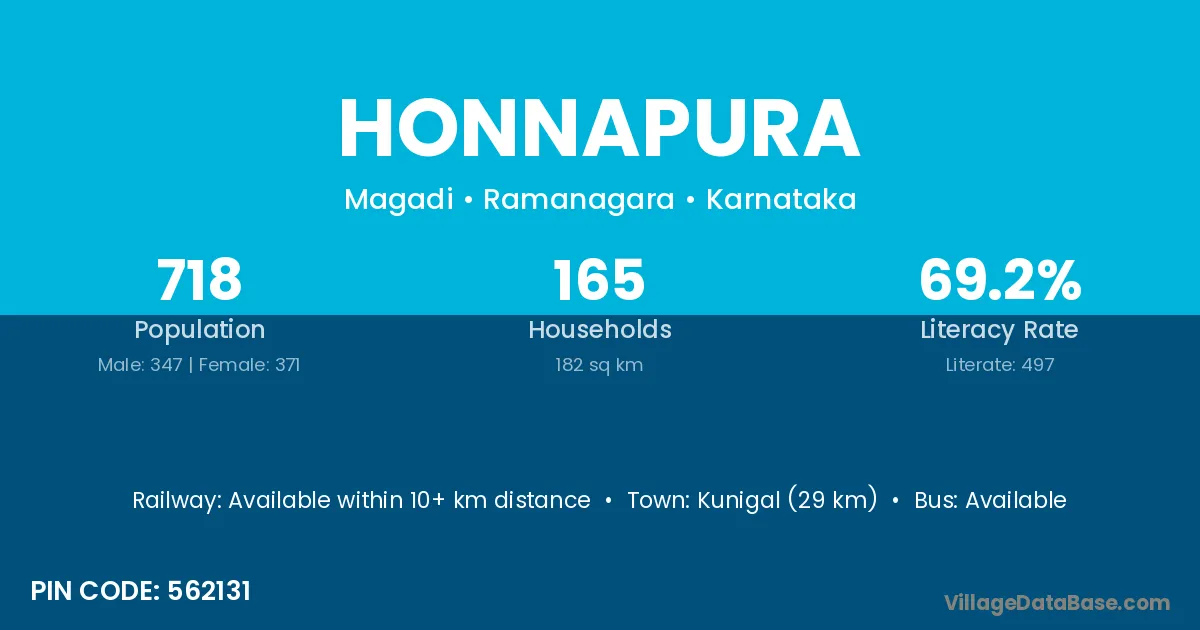 Kunigal (29 km) is the nearest town to Honnapura village for major economic activities and is located approximately 29 km away.
