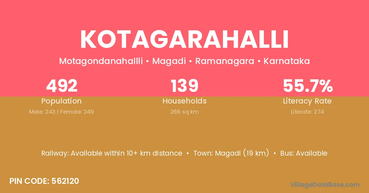 Kotagarahalli village has a total population of 492 people, of which 243 are males and 249 are females.