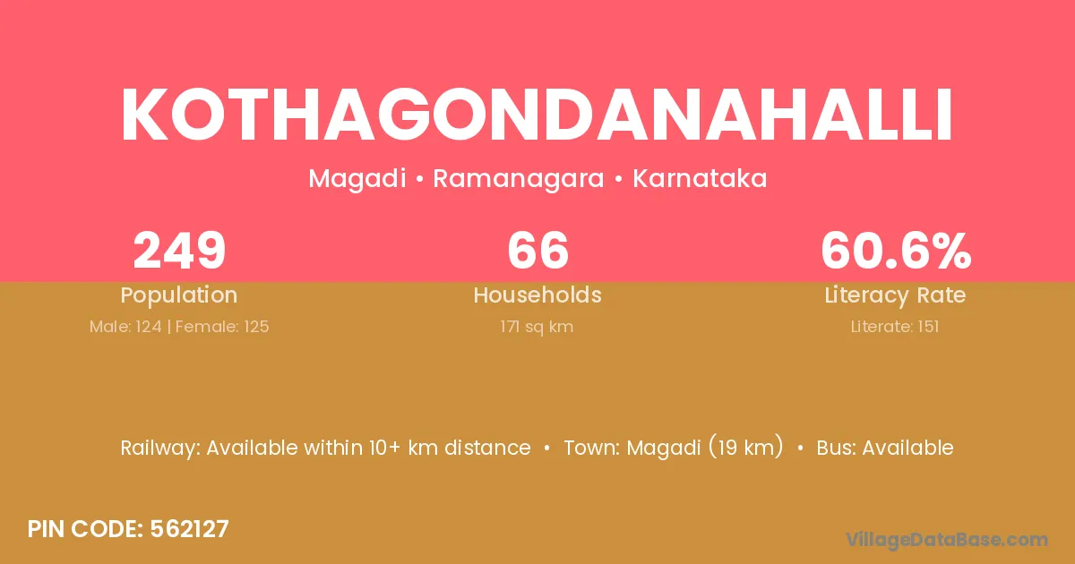 Magadi (19 km) is the nearest town to Kothagondanahalli village for major economic activities and is located approximately 19 km away.
