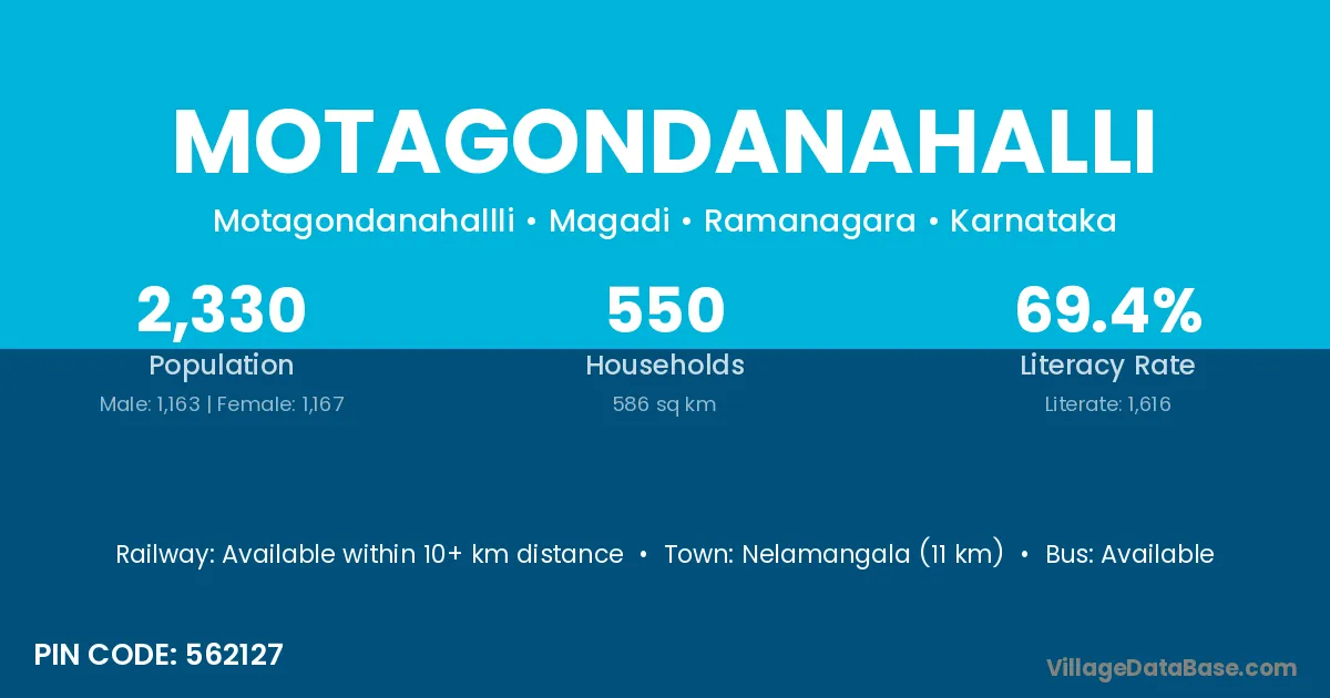 Nelamangala (11 km) is the nearest town to Motagondanahalli village for major economic activities and is located approximately 11 km away.