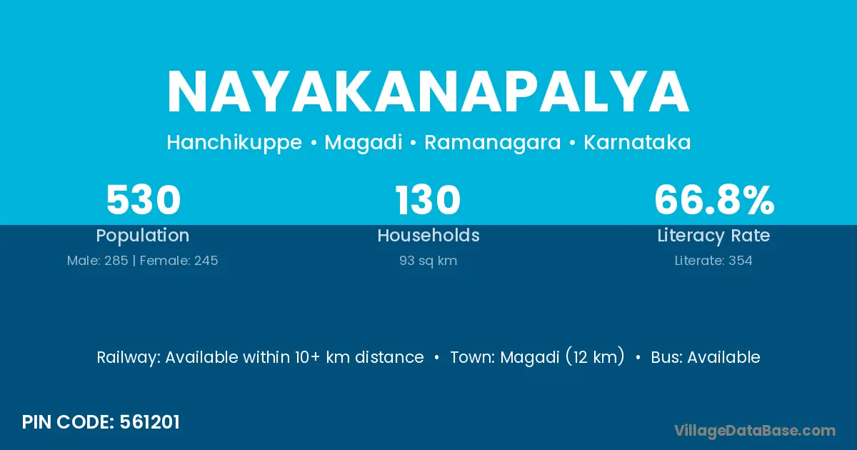Magadi (12 km) is the nearest town to Nayakanapalya village for major economic activities and is located approximately 12 km away.