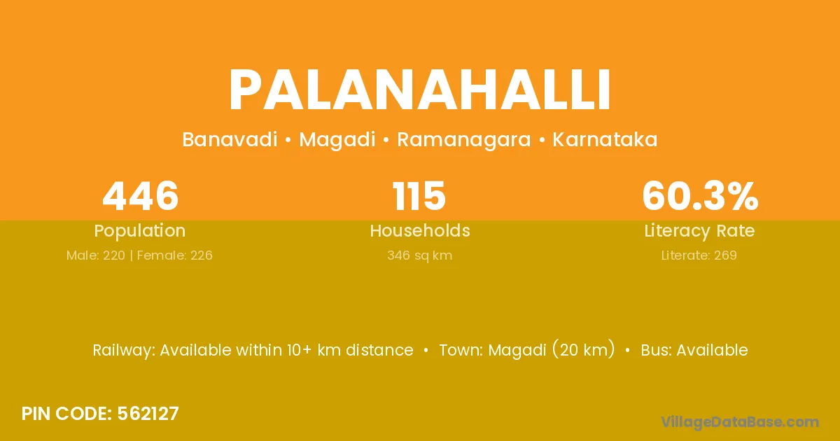 Palanahalli village has a total population of 446 people, of which 220 are males and 226 are females.