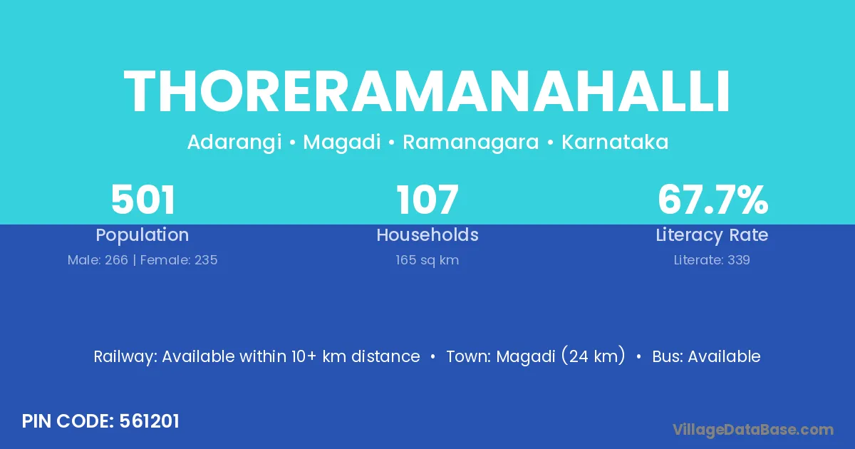 Magadi (24 km) is the nearest town to Thoreramanahalli village for major economic activities and is located approximately 24 km away.