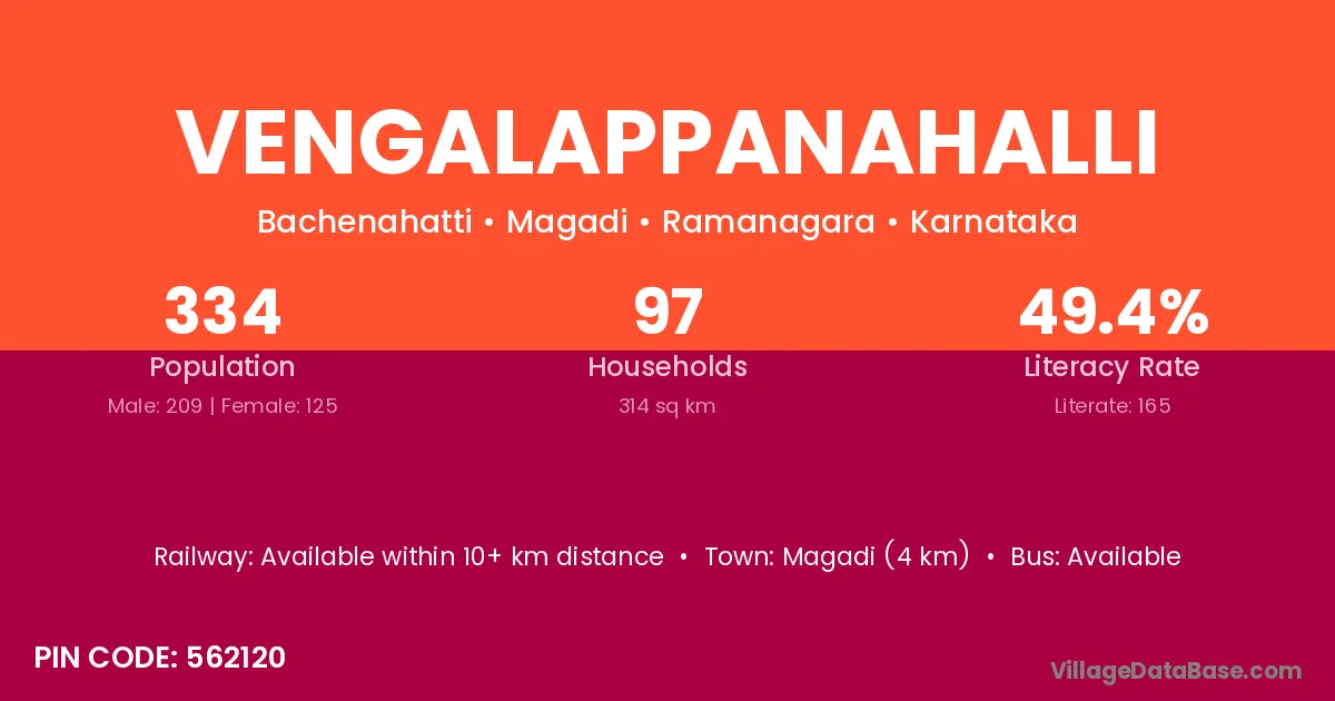 Magadi (4 km) is the nearest town to Vengalappanahalli village for major economic activities and is located approximately 4 km away.