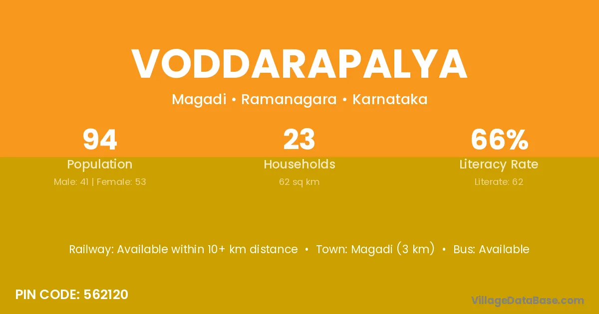 Magadi (3 km) is the nearest town to Voddarapalya village for major economic activities and is located approximately 3 km away.