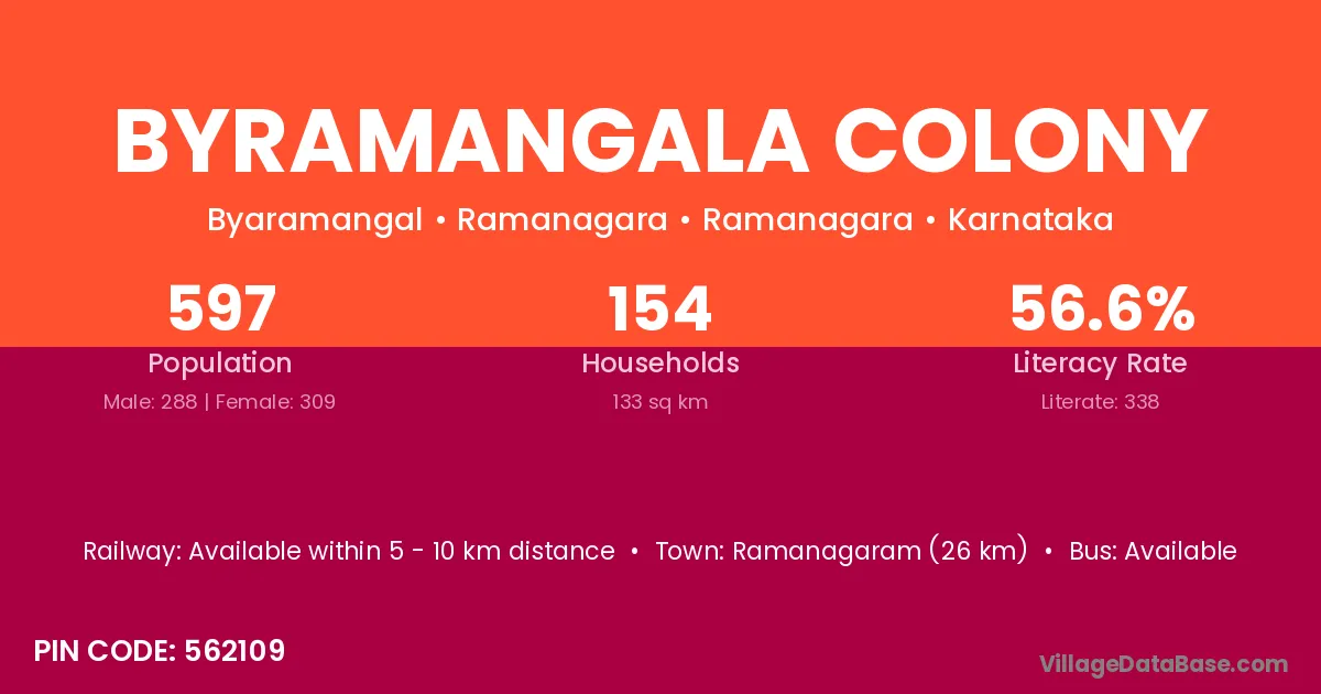Byramangala Colony village has a total population of 597 people, of which 288 are males and 309 are females.